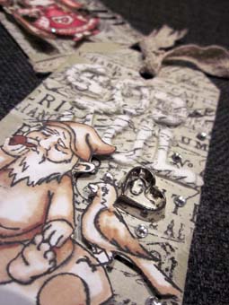 Tagsen är dekorerade med bla Tim Holtz tejp (som jag bara älskar) och Omonterade stämplar från panduro.